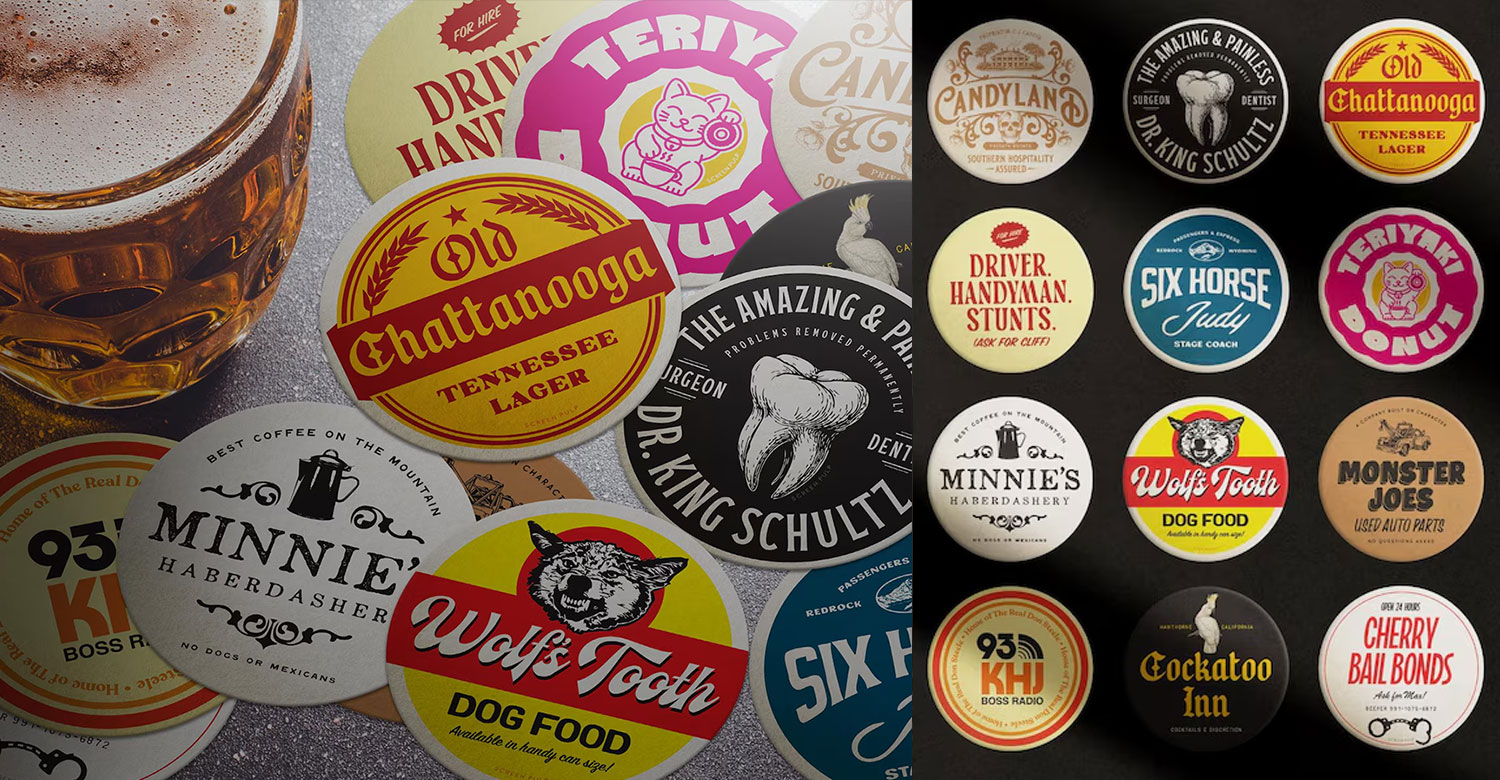 Quentin Tarantino movies inspired original designs. Printed on traditional beermat pulp board. Sealed with branded string and washer envelope. 12 new designs featuring characters, locations and fictional brands from Pulp Fiction, Jackie Brown, Django Unchained, The Hateful Eight and Once Upon a Time in Hollywood.